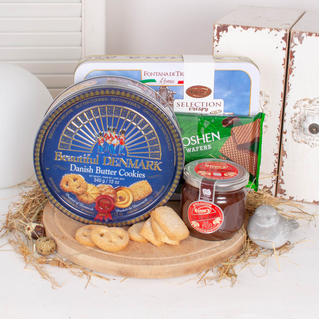 Cele mai speciale ocazii au nevoie de cadouri pe masura. Iar Pastele mereu ne va aduce aminte de cadourile primite in copilarie de la Iepuras. Comanda acest cadou cu praline de ciocolata, biscuiti danezi, napolitana roches si crema de ciocolata si transforma o zi normala intr-o amintire memorabila. Cadourile gourmet de Paste sunt perfecte atunci cand vrem sa facem o surpriza frumoasa atat celor dragi cat si partenerilor de afaceri.