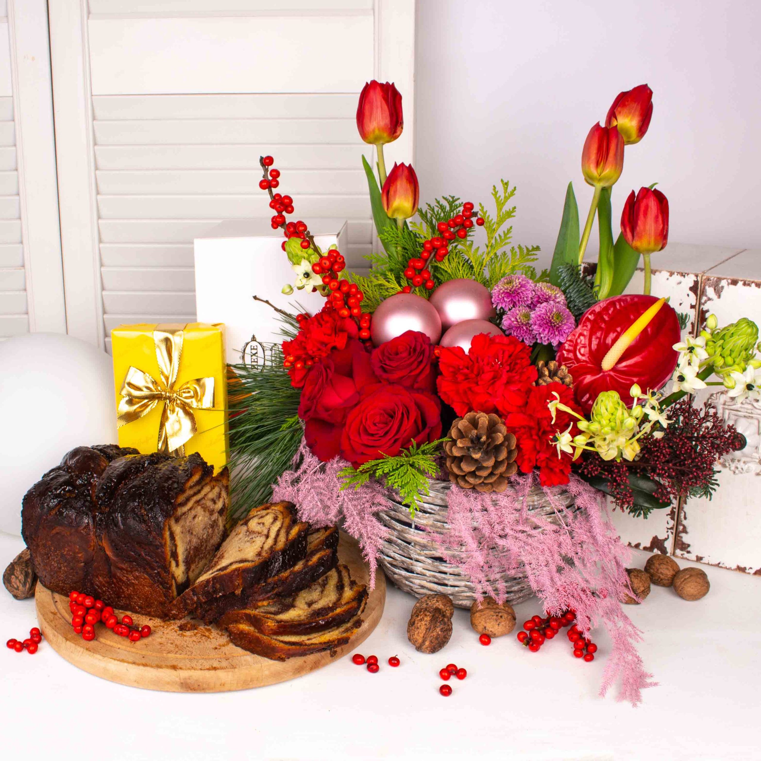 Cele mai speciale ocazii au nevoie de cadouri pe masura. Transforma o aniversare intr-o amintire frumoasa cu acest aranjament floral cu lalele, trandafiri rosii, globuri de Craciun si Cozonac cu nuca insiropat cu vinars de la Braseria Zexe. Cel mai frumos moment este acela in care ne oferim cadouri, in care daruim zambete celor dragi. Un cos cadou gourmet sau un cos cadou corporate este un fel simplu si frumos de a ne arata recunostinta, sau de a felicita pe cineva. Am ales produse de calitate, astfel incat apropiatii nostri, colegii sau partenerii de afaceri sa aiba parte de o surpriza frumoasa. Cozonac artizanal cu cacao si nuca sau mai bine, Cozonacul cu nuca insiropat cu vinars de la Braseria Zexe (bun de te lingi pe degete, la propriu!), Panetone cu ciocolata italienesc, Macarons si Chec artizanal cu ciocolata si portocale tot de la Braseria Zexe, paste delicioase si sosuri bine alese, Parmigiano Reggiano si Pecorino Romano de iti lasa gura apa, turta dulce, praline de ciocolata, fursecuri apetisante cu unt si bineinteles, nu puteam sa nu stropim totul cu vinuri rafinate (Tufoaie Soave Superiore Classico, Maison Castel Syrah Grande Reserve, Cabernet Suvignon Cricova Vintage Collection, Chardonnay Cricova Vintage Collection) dar si Prosecco si sampanie Moet. Pentru petrecareti, am strecurat si cateva cadouri cu London Dry Gin Tanqueray si apa tonica Sanpellegrino. Adauga un mesaj personaliat si noi plecam de indata sa facem ceea ce stim noi mai bine, adica sa livram emotii.