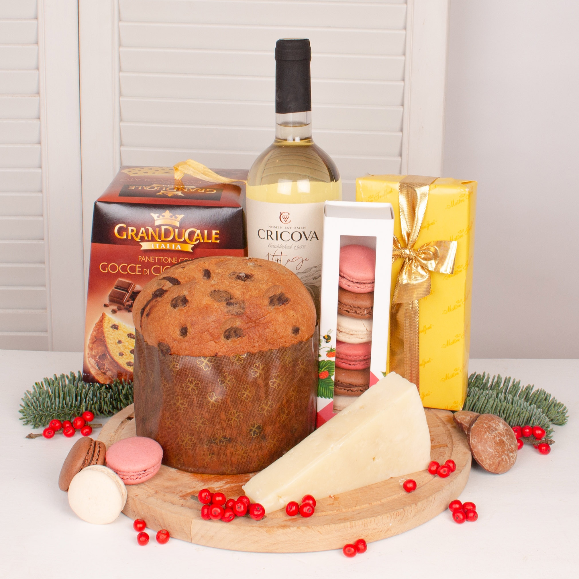 Cele mai speciale ocazii au nevoie de cadouri pe masura. Transforma o aniversare intr-o amintire frumoasa cu acest Cos cadou Panetone cu ciocolata italienesc, vin Chardonnay Cricova Vintage Collection, branza Pecorino Romano si macarons. Cel mai frumos moment este acela in care ne oferim cadouri, in care daruim zambete celor dragi. Un cos cadou gourmet sau un cos cadou corporate este un fel simplu si frumos fel de a ne arata recunostinta, sau de a felicita pe cineva. Am ales produse de calitate, astfel incat apropiatii nostri, colegii sau partenerii de afaceri sa aiba parte de o surpriza frumoasa. Cozonac artizanal cu cacao si nuca sau mai bine, Cozonacul cu nuca insiropat cu vinars de la Braseria Zexe (bun de te lingi pe degete, la propriu!), Panetone cu ciocolata italienesc, Macarons si Chec artizanal cu ciocolata si portocale tot de la Braseria Zexe, paste delicioase si sosuri bine alese, Parmigiano Reggiano si Pecorino Romano de iti lasa gura apa, turta dulce, praline de ciocolata, fursecuri apetisante cu unt si bineinteles, nu puteam sa nu stopim totul cu vinuri rafinate (Tufoaie Soave Superiore Calssico, Maison Castel Syrah Grande Reserve, Cabernet Suvignon Cricova Vintage Collection, Chardonnay Cricova Vintage Collection) dar si Prosecco si sampanie Moet. Pentru petrecareti, am strecurat si cateva cadouri cu London Dry Gin Tanqueray si apa tonica Sanpellegino. Adauga un mesaj personaliat si noi plecam de indata sa facem ceea ce stim noi mai bine, adica sa livram emotii.