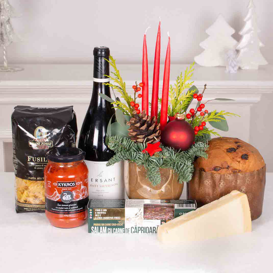 Cele mai speciale ocazii au nevoie de cadouri pe masura. Transforma o petrecere intr-o amintire frumoasa cu acest cos cadou cu Aranjament cu lumanari si brad, vin rosu, panetone, paste, sos si salam caprioara. Cel mai frumos moment este acela in care ne oferim cadouri, in care daruim zambete celor dragi.