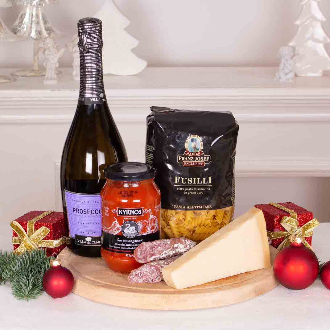 Cele mai speciale ocazii au nevoie de cadouri pe masura. Transforma o aniversare intr-o amintire frumoasa cu acest Cos cadou cu Specialitati si Prosecco . Cel mai frumos moment este acela in care ne oferim cadouri, in care daruim zambete celor dragi. Un cos cadou gourmet sau un cos cadou corporate este un fel simplu si frumos de a ne arata recunostinta, sau de a felicita pe cineva. Am ales produse de calitate, astfel incat apropiatii nostri, colegii sau partenerii de afaceri sa aiba parte de o surpriza frumoasa. Cozonac artizanal cu cacao si nuca sau mai bine, Cozonacul cu nuca insiropat cu vinars de la Braseria Zexe (bun de te lingi pe degete, la propriu!), Panettone Gran Ducale cu stafide , Chec artizanal cu ciocolata si portocale tot de la Braseria Zexe, paste delicioase si sosuri bine alese, Parmigiano Reggiano , turta dulce, praline de ciocolata, fursecuri apetisante cu unt si bineinteles, nu puteam sa nu stropim totul cu vinuri rafinate (Le Versant Cabernet Sauvignon, Wine Crime Rose, Cabernet Sauvignon Cricova Vintage Collection, Chardonnay Cricova Vintage Collection) dar si cu Prosecco si sampanie Moet. Adauga un mesaj personalizat si noi plecam de indata sa facem ceea ce stim noi mai bine, adica sa livram emotii.