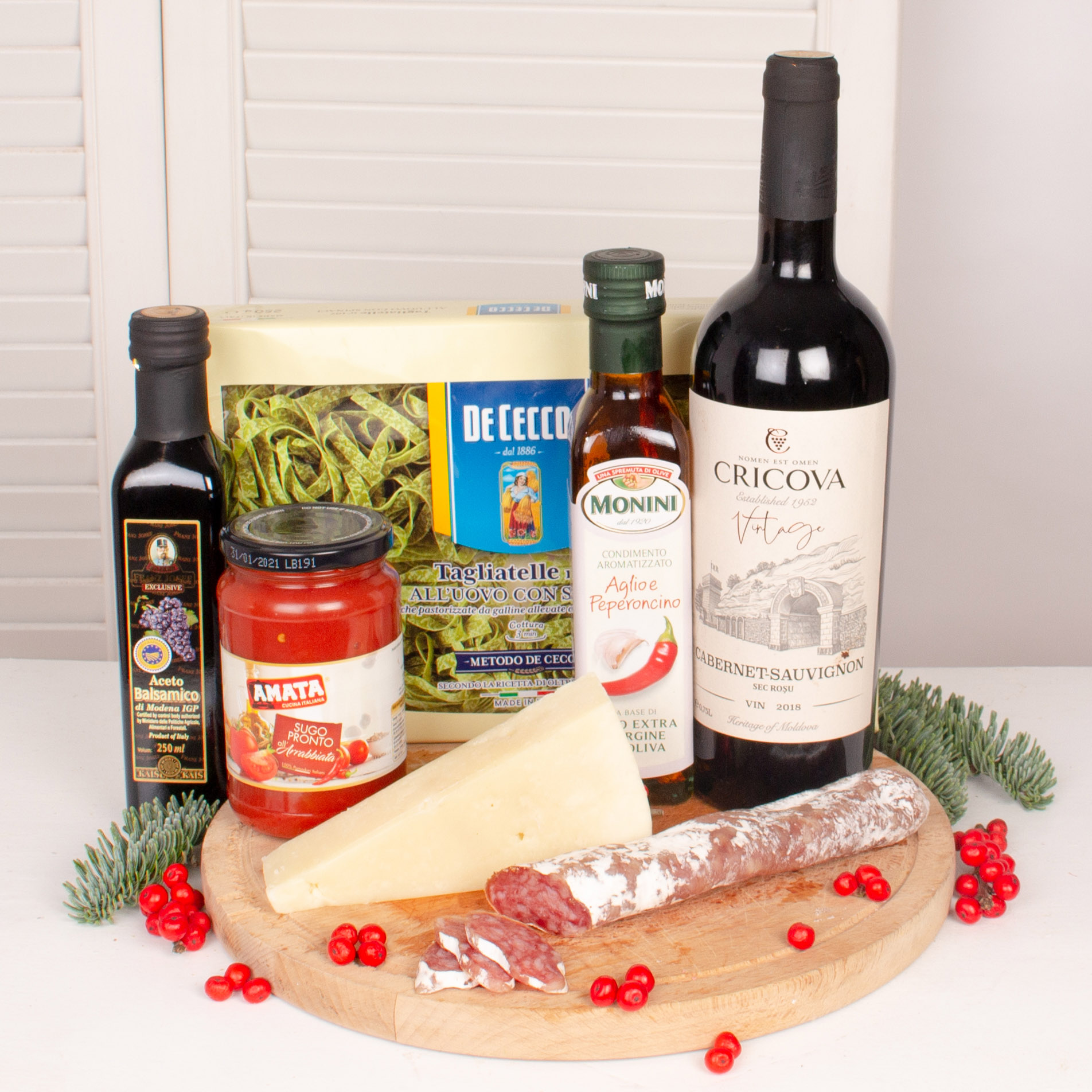 Cele mai speciale ocazii au nevoie de cadouri pe masura. Transforma o aniversare intr-o amintire frumoasa cu acest Cos cadou cu tagliatelle cu spanac Dececco, sosuri bine alese, branza pecorino Romano Ambrosi si vin Cricova Cabernet Sauvignon rosu . Cel mai frumos moment este acela in care ne oferim cadouri, in care daruim zambete celor dragi. Un cos cadou gourmet sau un cos cadou corporate este un fel simplu si frumos fel de a ne arata recunostinta, sau de a felicita pe cineva. Am ales produse de calitate, astfel incat apropiatii nostri, colegii sau partenerii de afaceri sa aiba parte de o surpriza frumoasa. Cozonac artizanal cu cacao si nuca sau mai bine, Cozonacul cu nuca insiropat cu vinars de la Braseria Zexe (bun de te lingi pe degete, la propriu!), Panetone cu ciocolata italienesc, Macarons si Chec artizanal cu ciocolata si portocale tot de la Braseria Zexe, paste delicioase si sosuri bine alese, Parmigiano Reggiano si Pecorino Romano de iti lasa gura apa, turta dulce, praline de ciocolata, fursecuri apetisante cu unt si bineinteles, nu puteam sa nu stopim totul cu vinuri rafinate (Tufoaie Soave Superiore Calssico, Maison Castel Syrah Grande Reserve, Cabernet Suvignon Cricova Vintage Collection, Chardonnay Cricova Vintage Collection) dar si Prosecco si sampanie Moet. Pentru petrecareti, am strecurat si cateva cadouri cu London Dry Gin Tanqueray si apa tonica Sanpellegino. Adauga un mesaj personaliat si noi plecam de indata sa facem ceea ce stim noi mai bine, adica sa livram emotii.