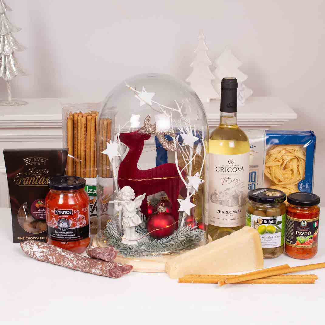 Cele mai speciale ocazii au nevoie de cadouri pe masura. Transforma o petrecere intr-o amintire frumoasa cu acest cos cadou cu Clopot de sticla cu ren rosu (inaltime 30 cm), vin alb, paste, sos, masline, parmezan si ciocolata. Cel mai frumos moment este acela in care ne oferim cadouri, in care daruim zambete celor dragi.