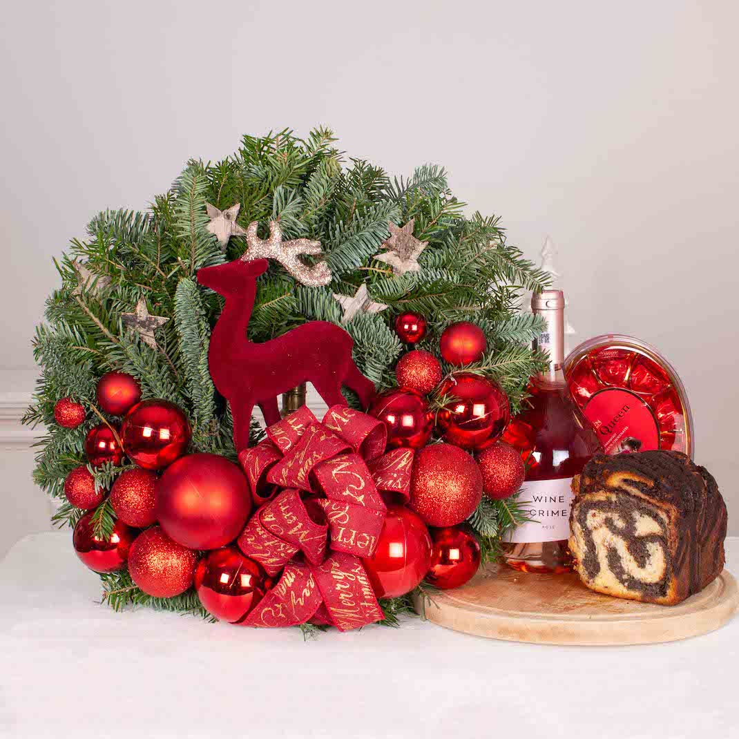 Cele mai speciale ocazii au nevoie de cadouri pe masura. Transforma o petrecere intr-o amintire frumoasa cu acest cos cadou cu Coronita de Craciun cu globuri rosii ,vin rose, praline de ciocolata cu visine si cozonacul cu nuca insiropat cu vinars de la Braseria Zexe (bun de te lingi pe degete, la propriu!). Cel mai frumos moment este acela in care ne oferim cadouri, in care daruim zambete celor dragi.