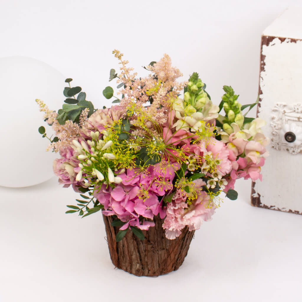 Aranjament cu hortensie roz, 3 astilbe roz, lisianthus roz, verdeata si alte flori de decor, cos cu scoarta.