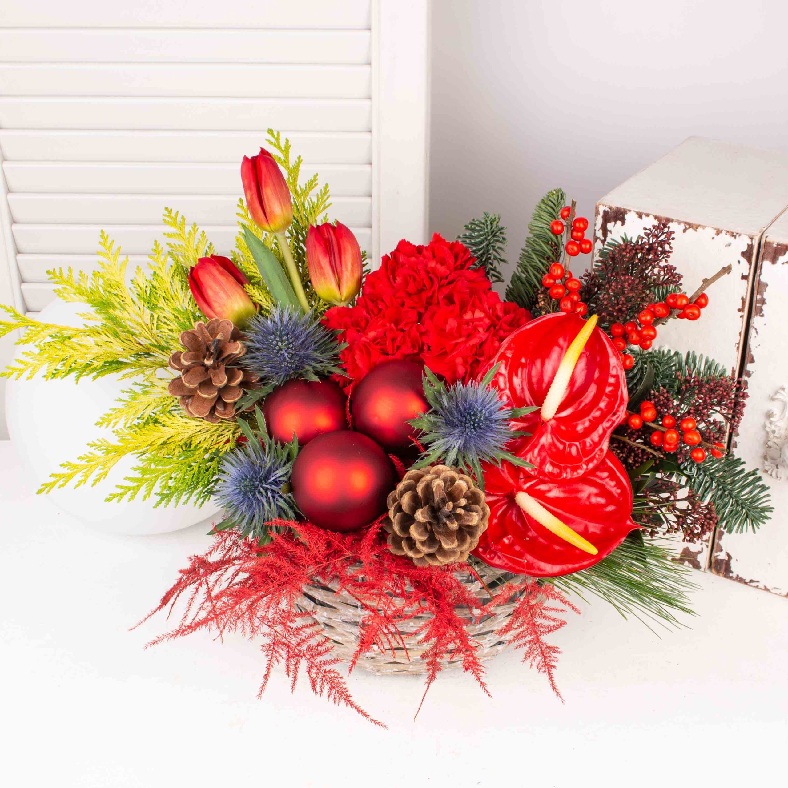 Aranjament in cos gri cu 3 globuri rosii, 2 anthurium rosii, 3 lalele rosii, eryngium albastru, verdeata si alte flori de decor.