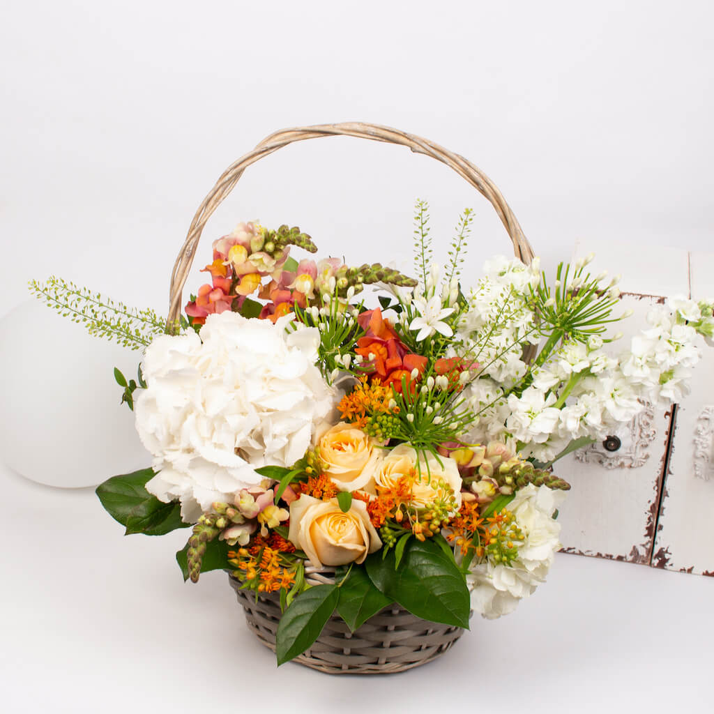 Aranjament in cos cu hortensie alba, 4 antirrhinum portocaliu, 3 trandafiri peach, 3 matthiola alba, verdeata si alte flori de decor.