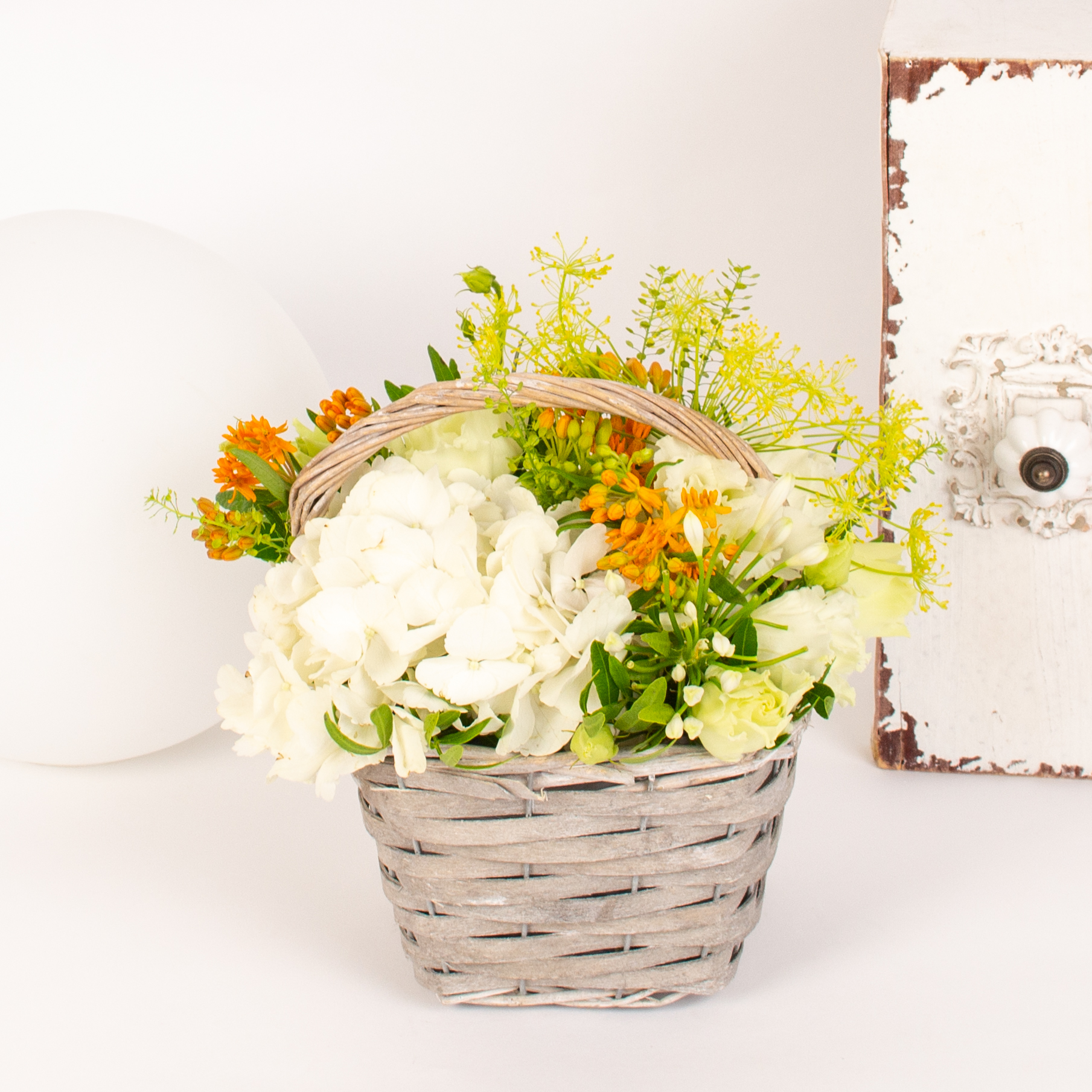 Aranjament in cos cu hortensie alba, lisianthus alb, agapanthus alb, verdeata si alte flori de decor.
