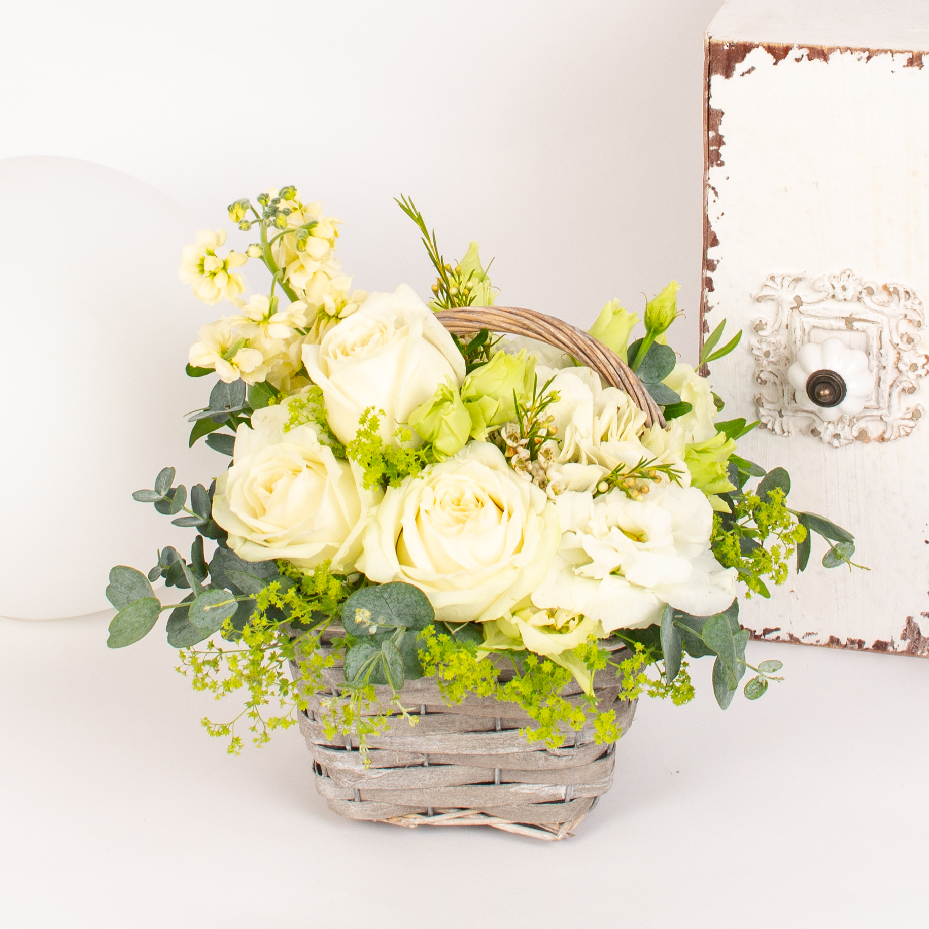 Aranjament in cos cu 3 trandafiri albi, matthiola, lisianthus alb, camelciu alb, verdeata si alte flori de decor.