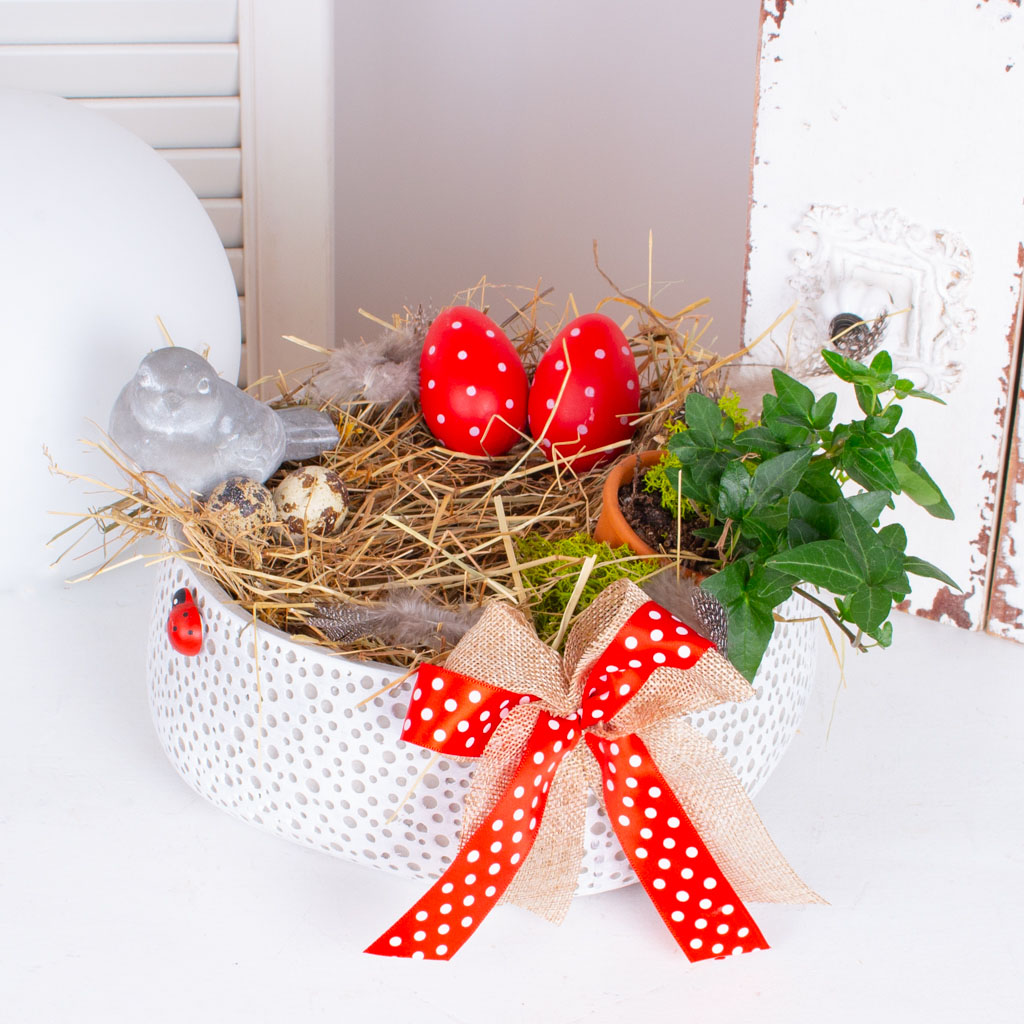 Sarbatorile sunt pentru noi si pentru cei mai apropiati sufletelor noastre. Acest aranjament care contine vas buline, pasare ciment, iedera si oua precum si celelalte aranjamentele de Paste cu iepurasi, gainuse, oua, ciupercute si gargarite vor fi in centrul atentiei oriunde le vei aseza. V-am pregatit aranjamente cu oua rosii, aranjamente cu decoratiuni cosuri cu iepurasi si plantute, cosuri cu bunatati si cosuri pentru oua pentru sarbatoarea de Paste. Aceste aranjamente va vor bine dispune la birou in timp ce lucrati sau acasa in timp ce pregatiti cozonacii si vor decora frumos masa de Paste. Un aranjament de Paste este cel mai frumos cadou pentru prieteni si familie.