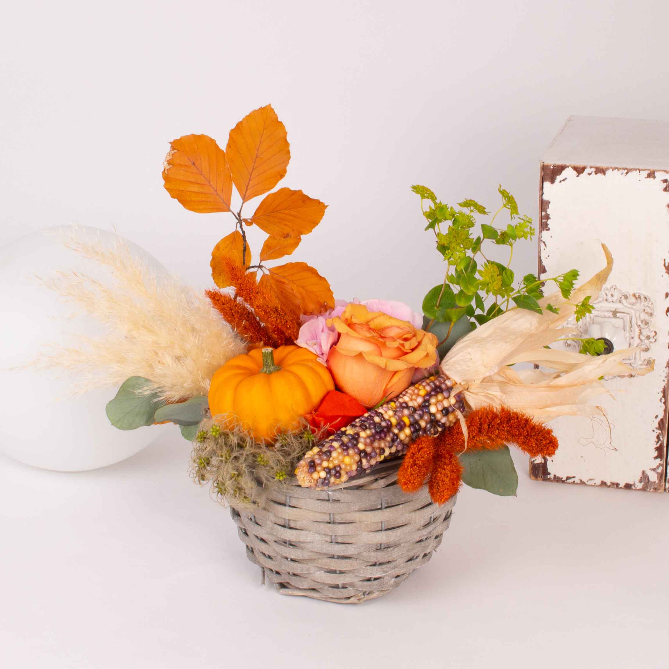 Aranjament in cos cu botan mic portocaliu, hortensia roz, trandafiri portocalii, verdeata si alte flori de decor.