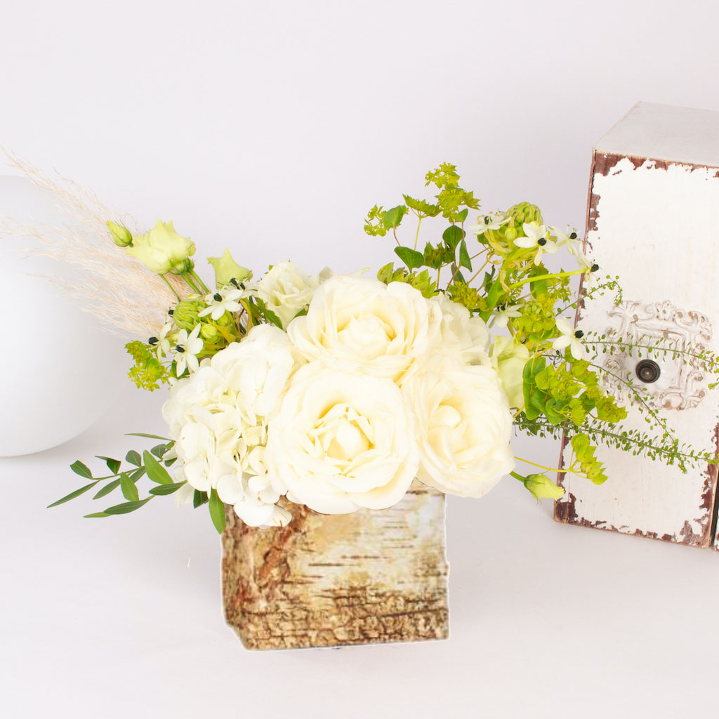 Aranjament in cos de tip scoarta cu hortensia alba, 3 trandafiri albi, lisianthus alb, verdeata si alte flori de decor.
