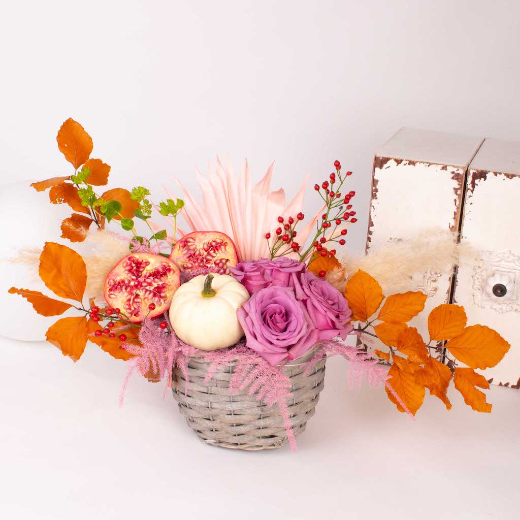 Iubim emotiile si bucuria pe care le vedem pe chipul celor care primesc flori si aranjamente florale pregatite in floraria Purple Flowers. De aceea ne straduim de fiecare data sa cream aranjamente unice care sa surprinda prin forma si culoare. Acest aranjament cu trandafiri, rodia si alte flori este cadoul de care ai nevoie atunci cand vrei sa spui „Te iubesc!” unei persoane dragi.