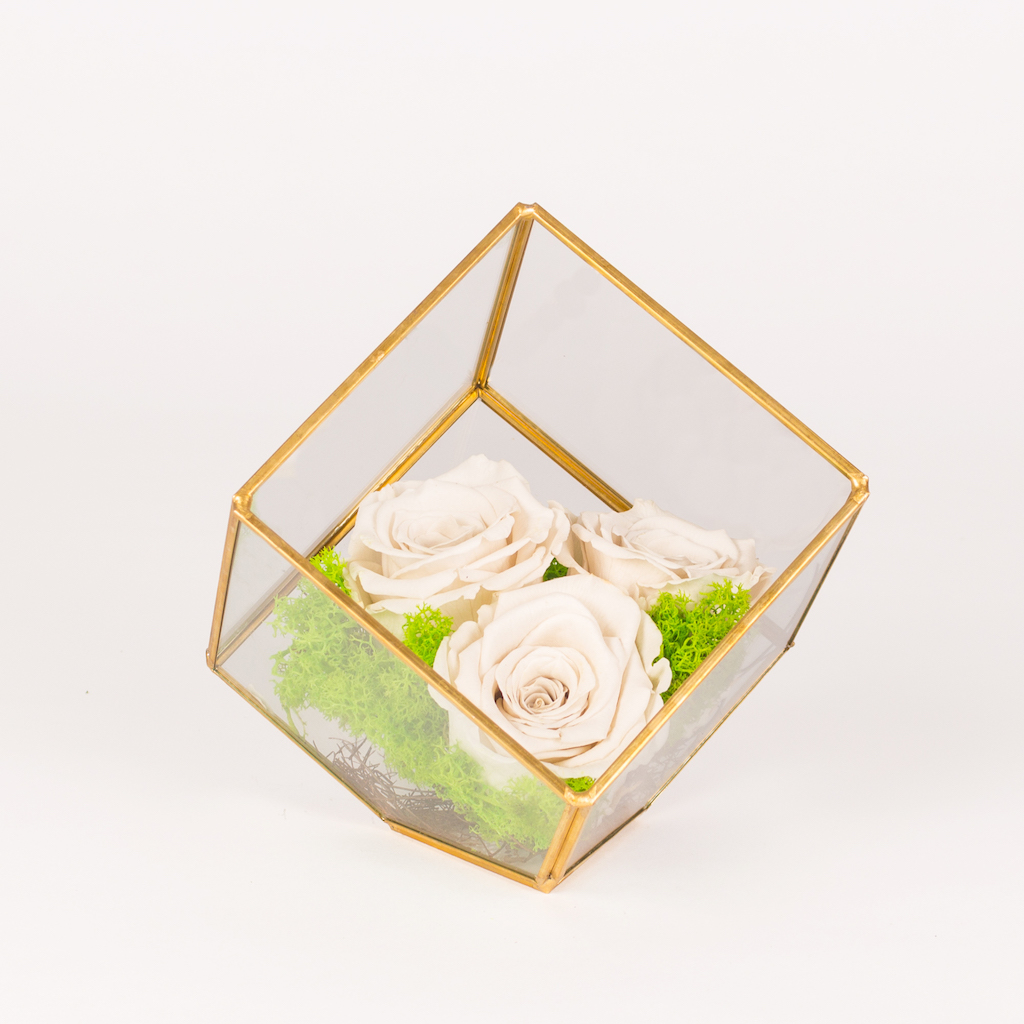 Dimensiunile terariului: latime 13cm, inaltime 20cm. 3 trandafiri conservati albi si muschi
