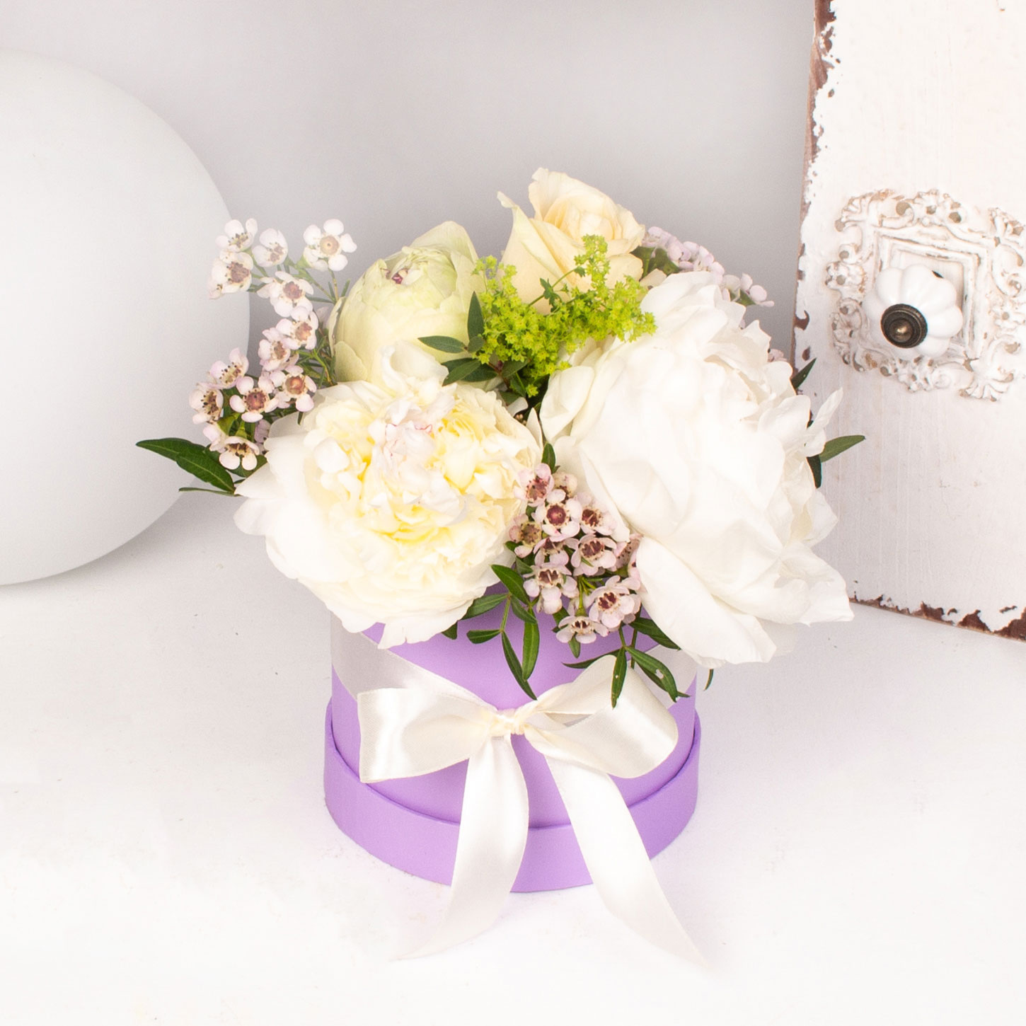 Cutie mov cu 3 bujori albi, trandafir, verdeata si alte flori.