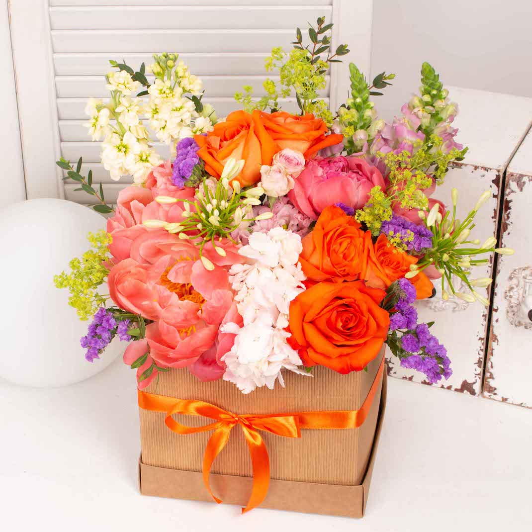 Exprima-ti sentimentele in flori si daruieste aceasta cutie cu bujori corai, trandafiri portocalii, hortensie si alte flori persoanei dragi. Florile acestea vor insenina ziua sotiei, mamei, iubitei, colegei sau sefei tale! Adauga mesajul tau personalizat iar noi pornim de indata sa o surprindem cu acest aranjament deosebit.