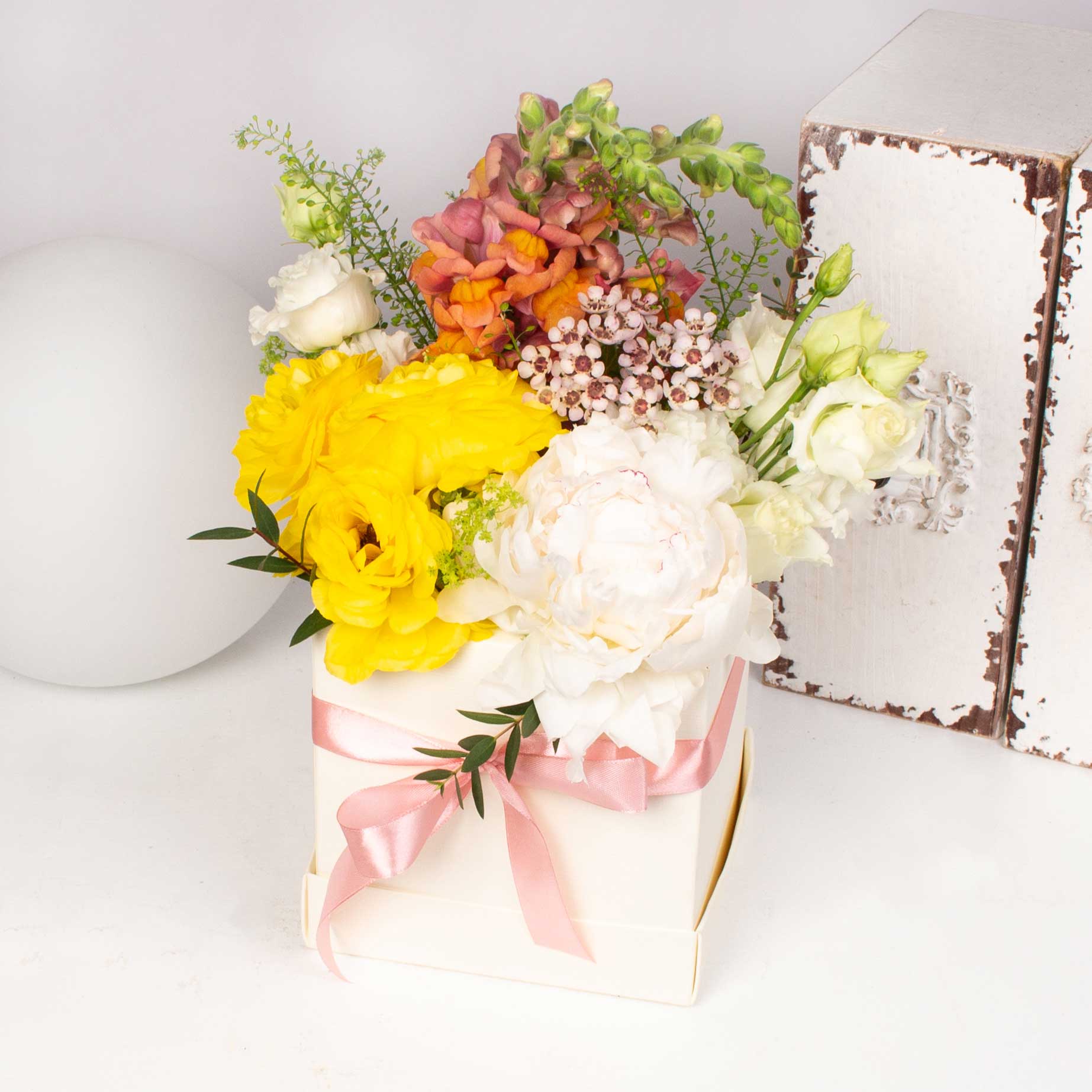 Cutie ivoire cu bujor alb, 3 ranunculus galben, lisianthus alb, 3 ranunculus galben, verdeata si alte flori de decor.
