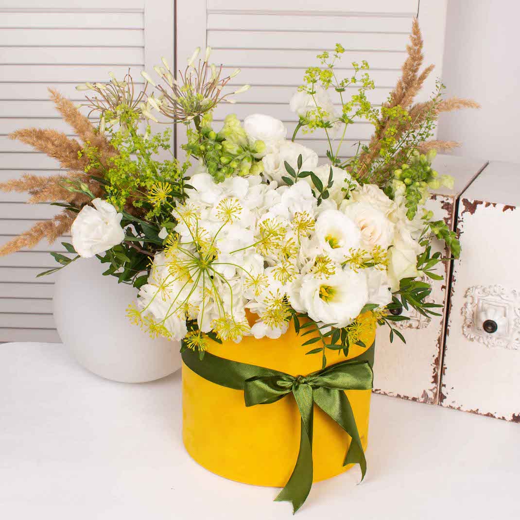 Cutie galbena de catifea cu hortensie alba, 3 trandafiri albi, 3 lisianthus alb, verdeata si alte flori de decor