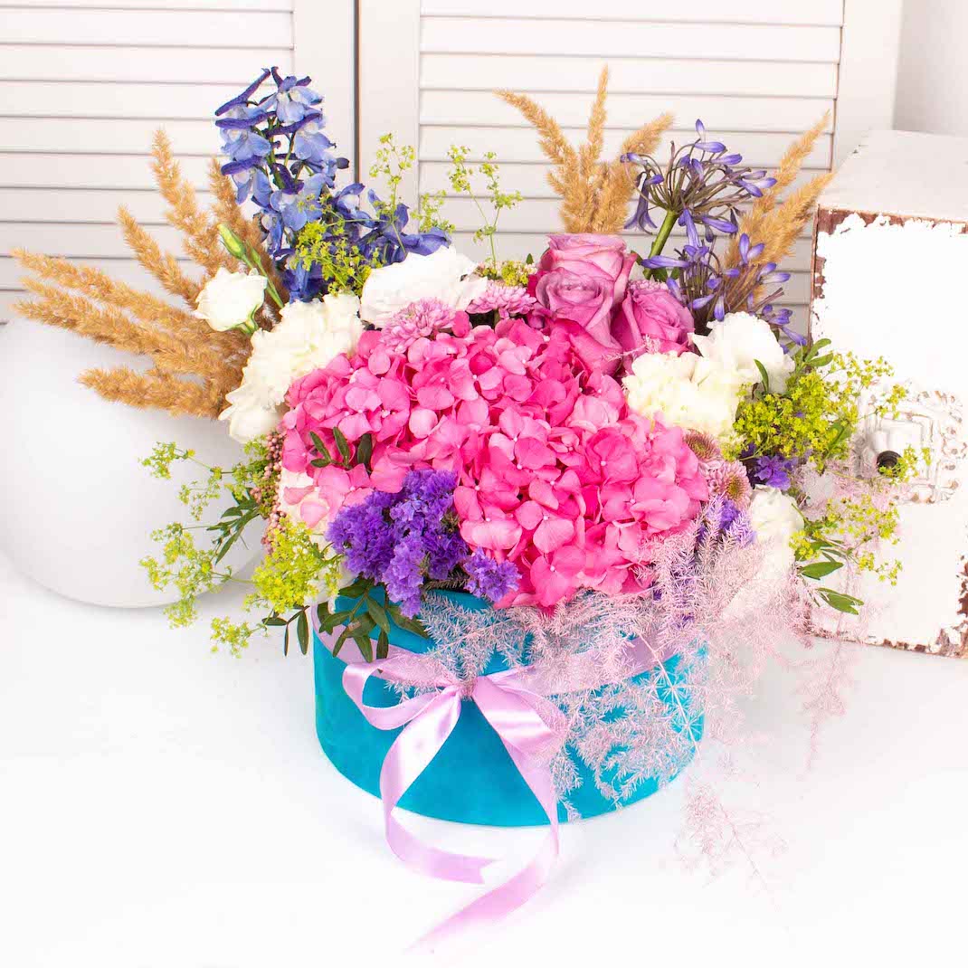 Exprima-ti sentimentele in flori si daruieste aceasta cutie cu trandafir, lisianthus, hortensie si alte flori persoanei dragi. Florile acestea vor insenina ziua sotiei, mamei, iubitei, colegei sau sefei tale! Adauga mesajul tau personalizat iar noi pornim de indata sa o surprindem cu acest aranjament deosebit.
