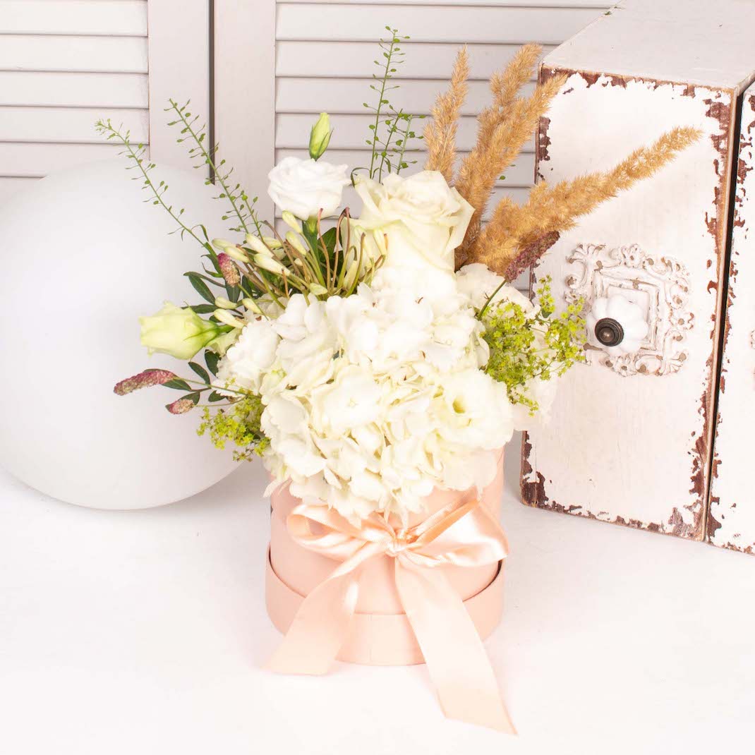 Exprima-ti sentimentele in flori si daruieste aceasta cutie cu trandafiri albi, hortensie si alte flori persoanei dragi. Florile acestea vor insenina ziua sotiei, mamei, iubitei, colegei sau sefei tale! Adauga mesajul tau personalizat iar noi pornim de indata sa o surprindem cu acest aranjament deosebit.