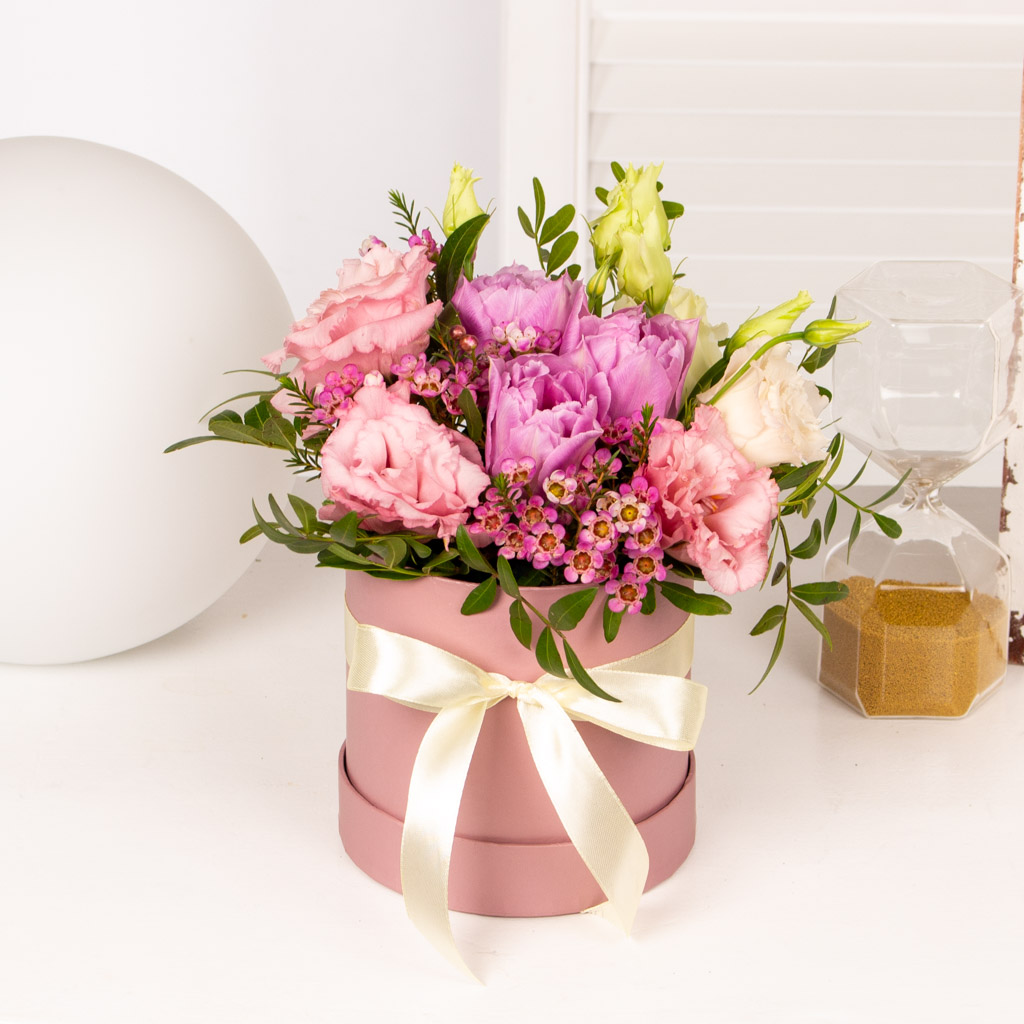 Cutie roz cu 3 lalele mov, lisianthus roz, lisianthus alb, verdeata si alte flori. Dimensiunile cutiei sunt 13×12,5cm