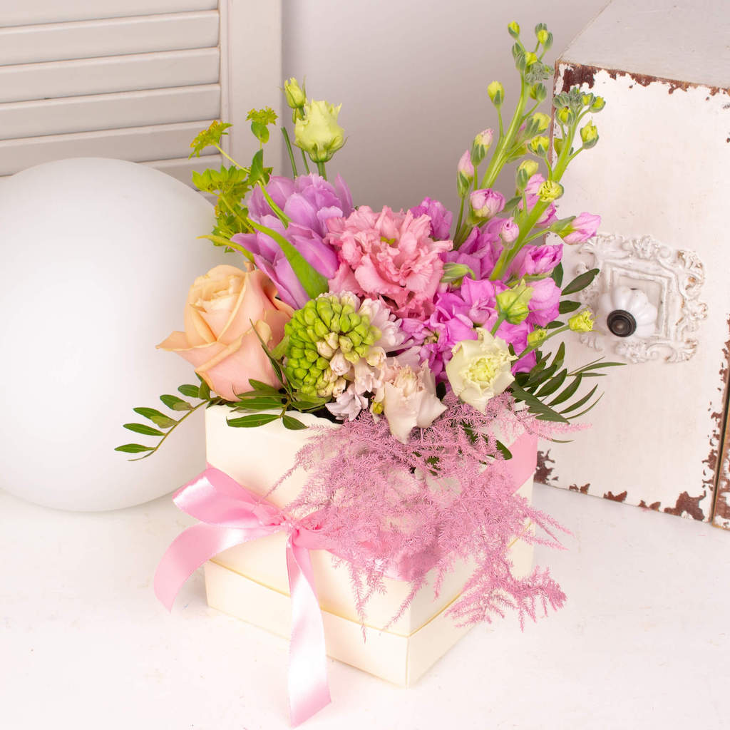 Cutie ivoire cu trandafir, 2 lalele roz, zambila roz, 2 matthiola, verdeata si alte flori.