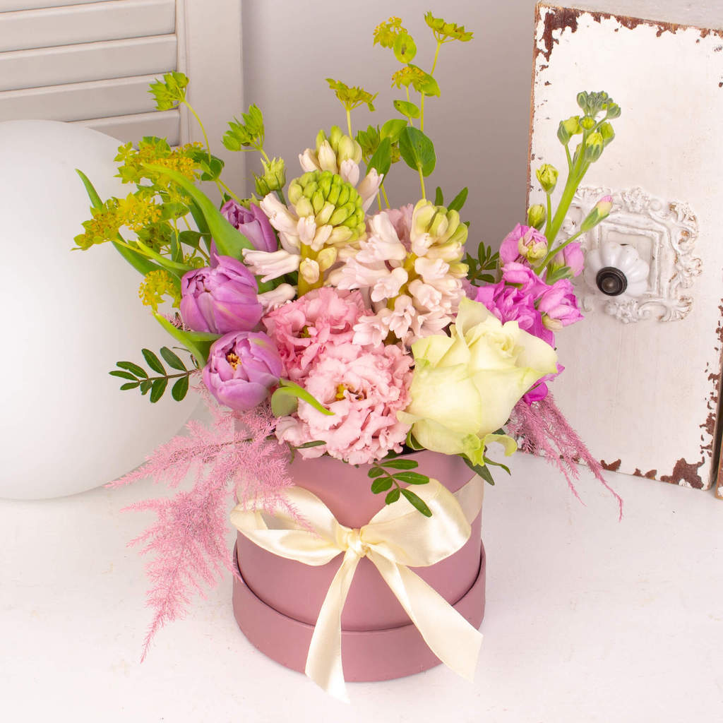 Cutie roz cu trandafir alb, lisianthus roz, matthiola roz, 3 lalele roz, verdeata si alte flori de decor.