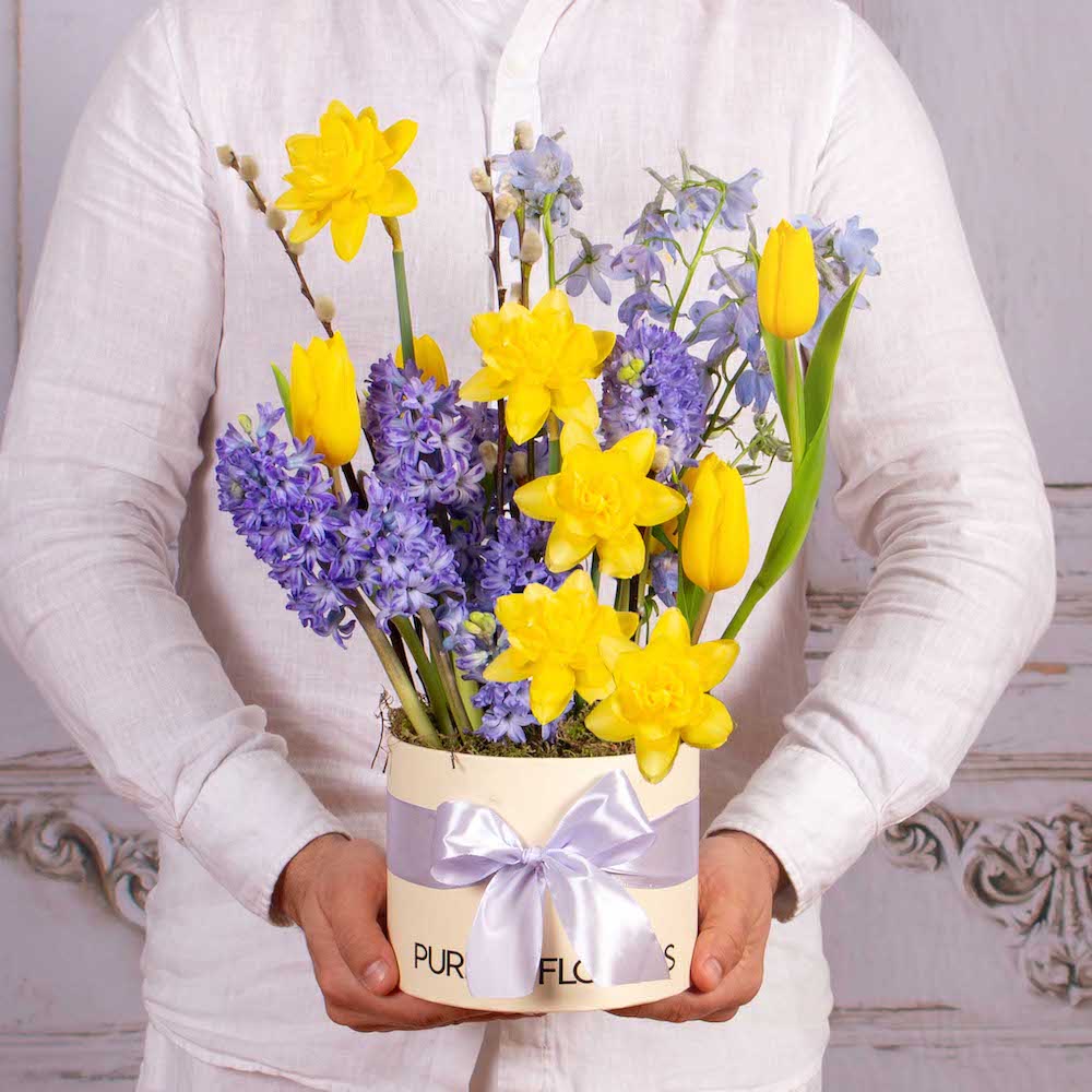 Exprima-ti sentimentele in flori si daruieste aceasta cutie cu delphinium, narcise si alte flori persoanei dragi. Florile acestea vor insenina ziua sotiei, mamei, iubitei, colegei sau sefei tale! Adauga mesajul tau personalizat iar noi pornim de indata sa o surprindem cu acest aranjament deosebit.