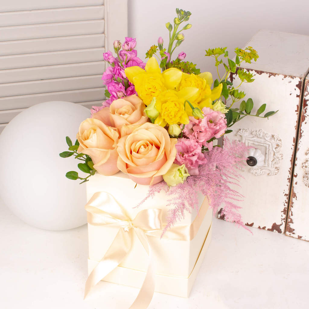 Exprima-ti sentimentele in flori si daruieste aceasta cutie cu trandafiri, narcise, matthiola si alte flori persoanei dragi. Florile acestea vor insenina ziua sotiei, mamei, iubitei, colegei sau sefei tale! Adauga mesajul tau personalizat iar noi pornim de indata sa o surprindem cu acest aranjament deosebit.