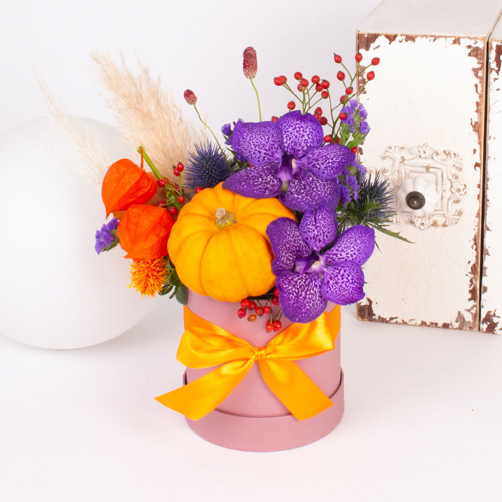 Exprima-ti sentimentele in flori si daruieste aceasta cutie cu orhidee vanda, macese, bostanel si alte flori persoanei dragi. Florile acestea vor insenina ziua sotiei, mamei, iubitei, colegei sau sefei tale! Adauga mesajul tau personalizat iar noi pornim de indata sa o surprindem cu acest aranjament deosebit.