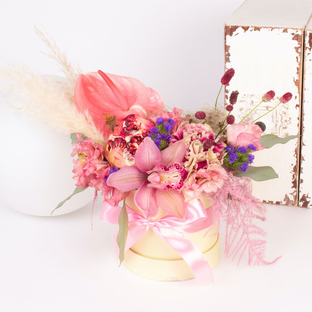 Exprima-ti sentimentele in flori si daruieste aceasta cutie cu rodie, anthurium, orhidee cymbidium si alte flori persoanei dragi. Florile acestea vor insenina ziua sotiei, mamei, iubitei, colegei sau sefei tale! Adauga mesajul tau personalizat iar noi pornim de indata sa o surprindem cu acest aranjament deosebit.