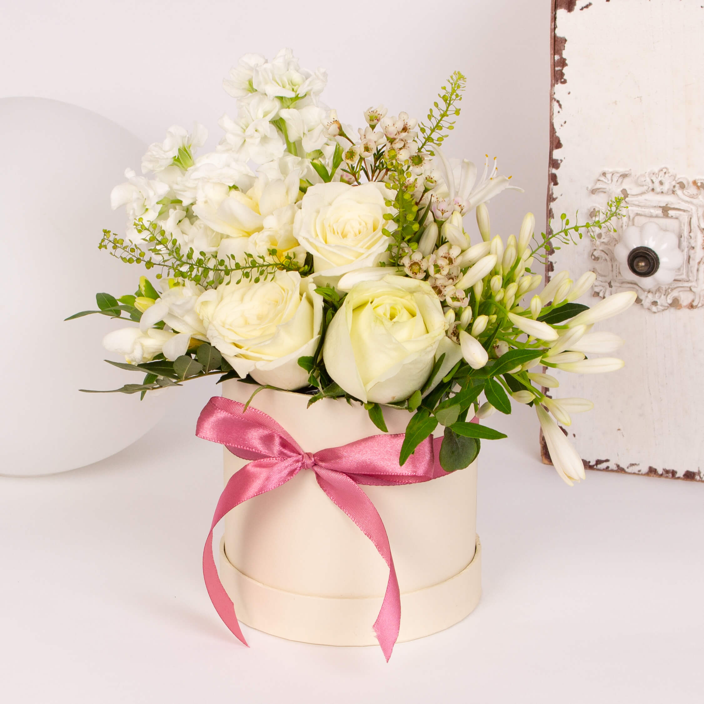 Cutie ivoire cu 3 trandafiri albi, 2 agapanthus alb, 2 matthiola alba, verdeata si alte flori de decor.