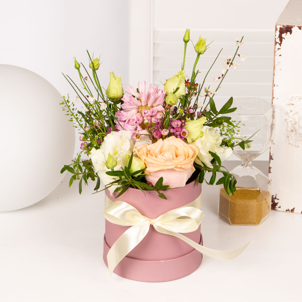Cutie roz cu trandafir, lisianthus alb, zambila roz, verdeata si alte flori. Dimensiunile cutiei sunt 13×12,5cm
