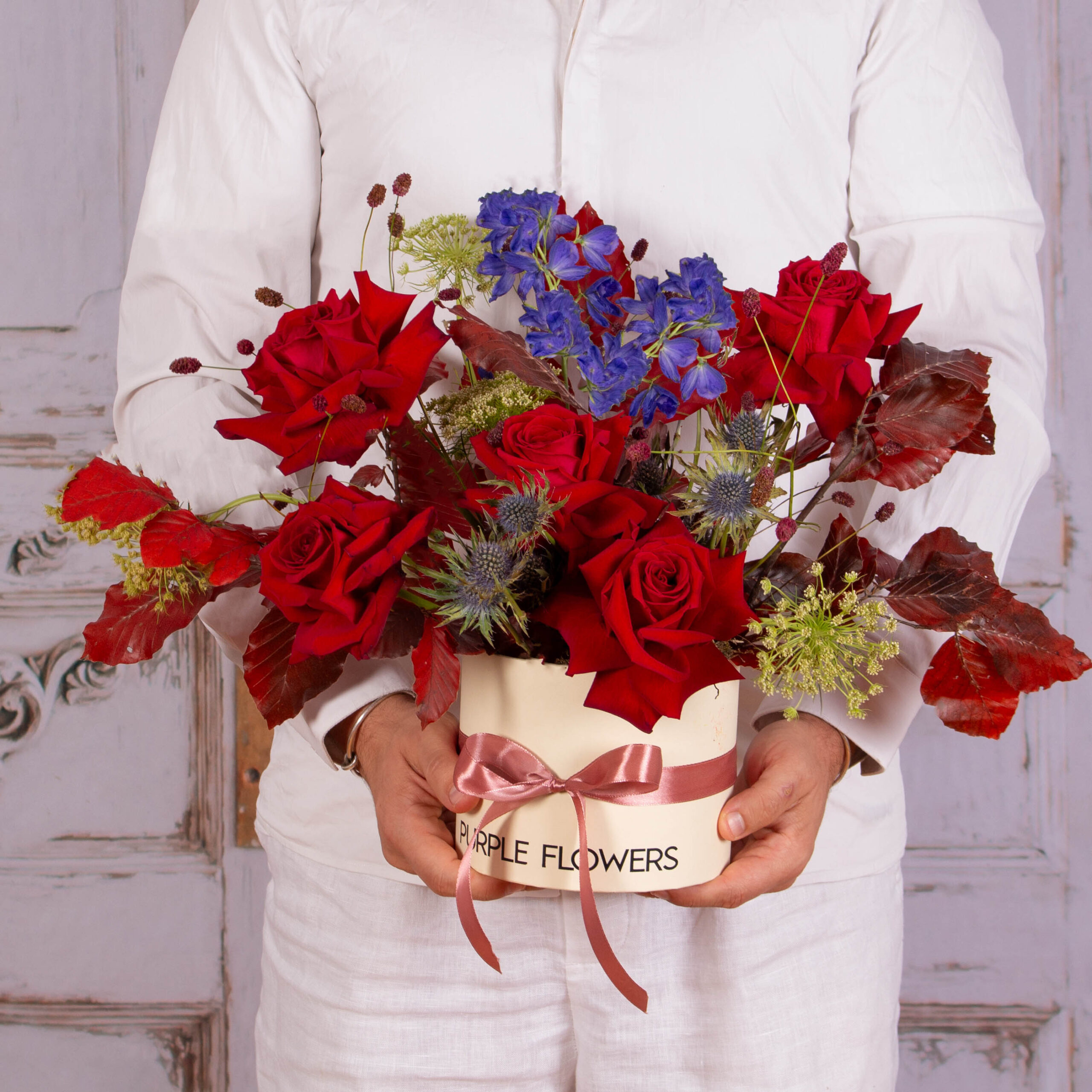 Exprima-ti sentimentele in flori si daruieste aceasta cutie cu eryngium, trandafiri, delphinium si alte flori persoanei dragi. Florile acestea vor insenina ziua sotiei, mamei, iubitei, colegei sau sefei tale! Adauga mesajul tau personalizat iar noi pornim de indata sa o surprindem cu acest aranjament deosebit.