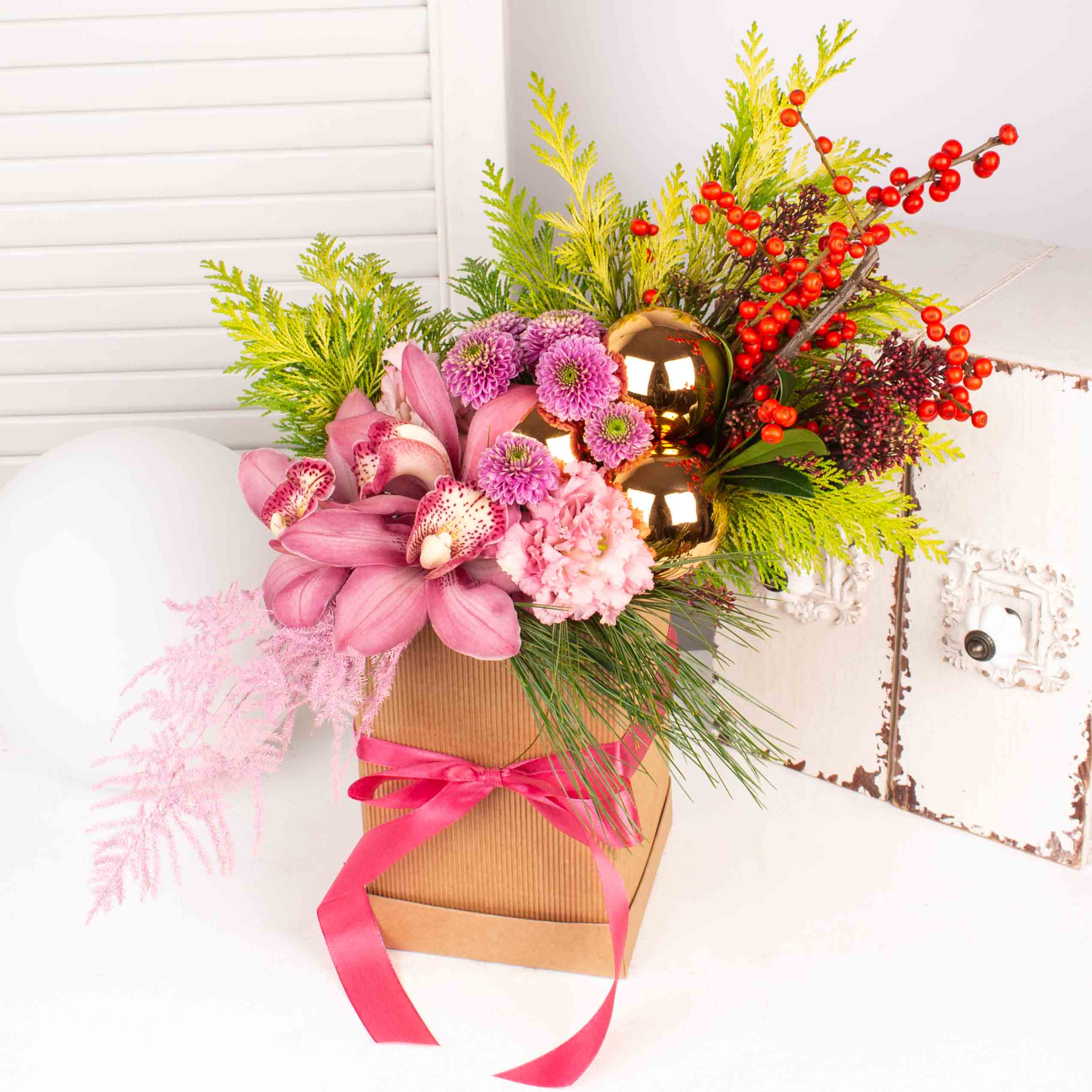 Aranjament in cutie cu 3 orhidee cymbidium roz, 3 globuri mari, lisianthus roz, asparagus roz, ilex rosu, verdeata si alte flori de decor.