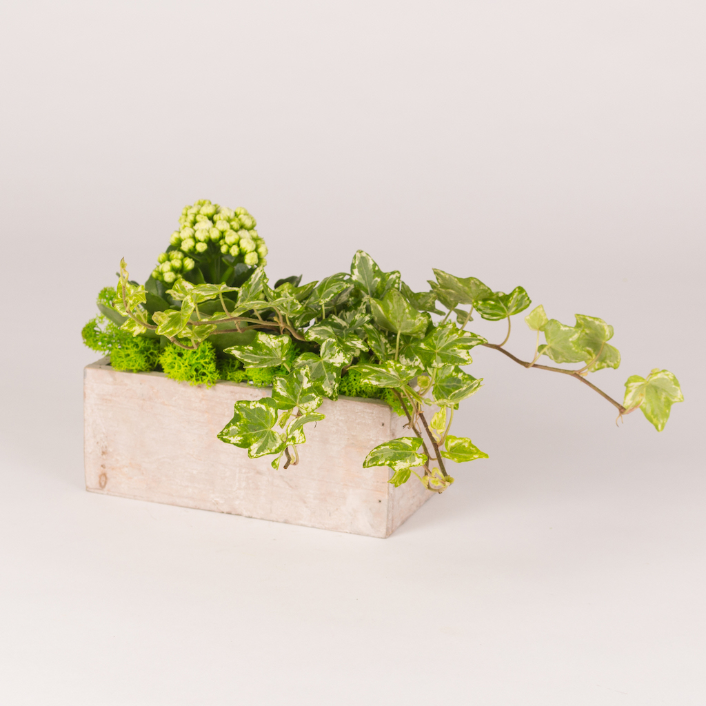 Terariu in cutie de lemn cu iedera, kalanchoe alba si muschi verde.