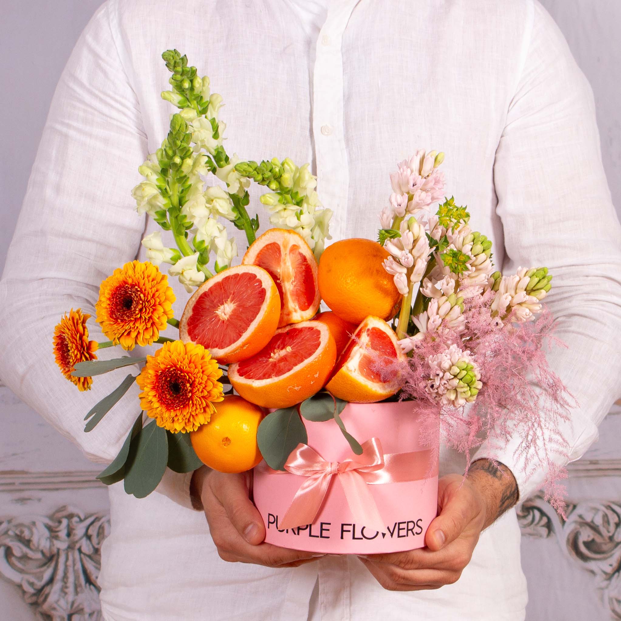 Cutie roz cu grapefruit, portocale, verdeata si alte flori