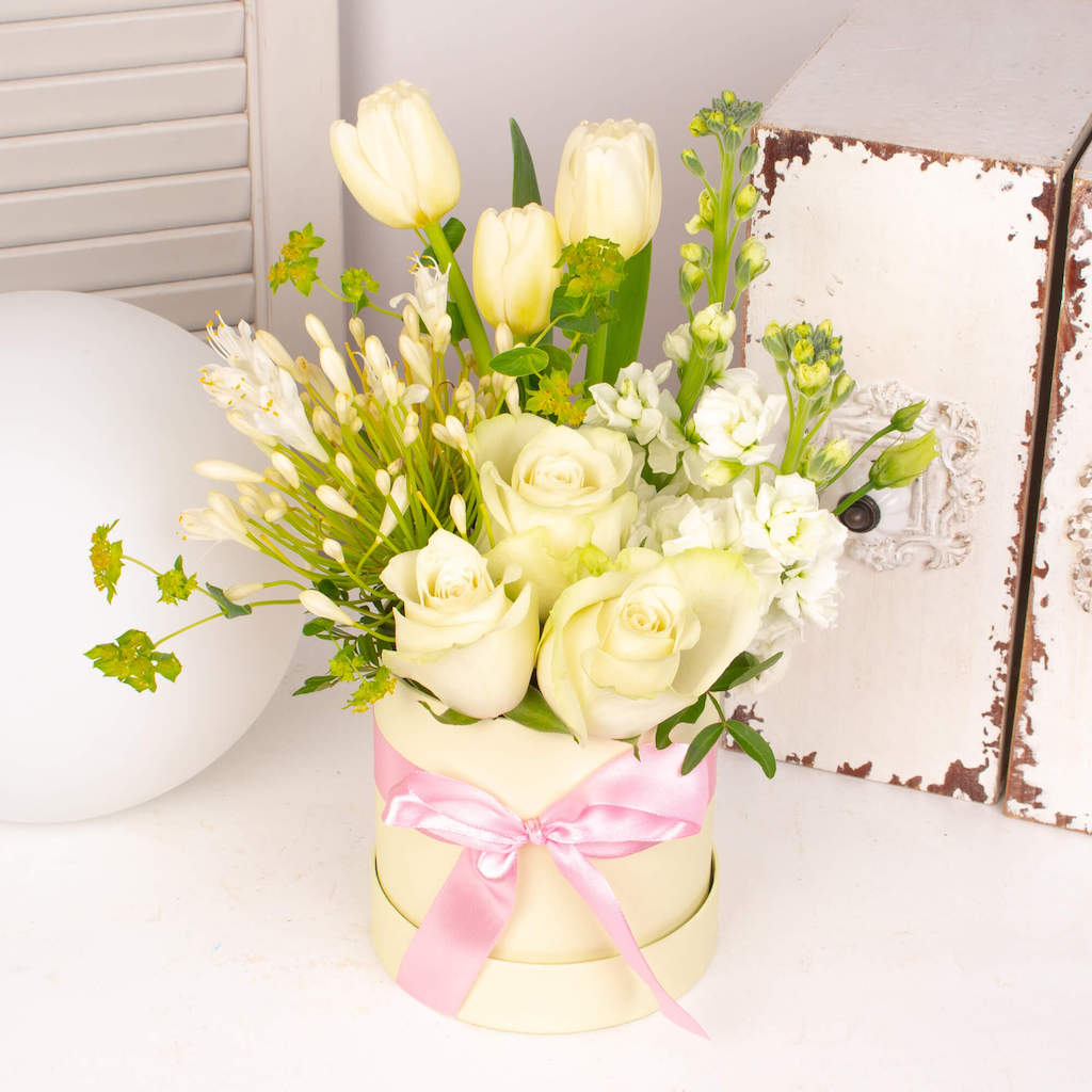 Cutie ivoire cu 3 trandafiri albi, 3 lalele albe, 2 agapanthus alb, 2 matthiola albe, verdeata si alte flori de decor.