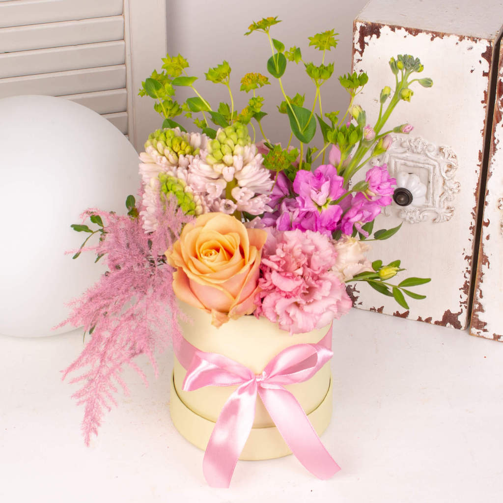 Exprima-ti sentimentele in flori si daruieste aceasta cutie cu trandafir, asparagus, zambile si alte flori persoanei dragi. Florile acestea vor insenina ziua sotiei, mamei, iubitei, colegei sau sefei tale! Adauga mesajul tau personalizat iar noi pornim de indata sa o surprindem cu acest aranjament deosebit.