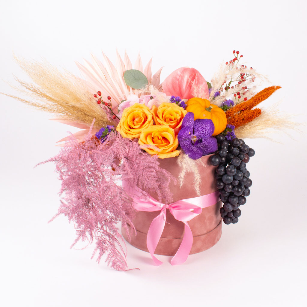 Exprima-ti sentimentele in flori si daruieste aceasta cutie cu trandafiri, bostanel, struguri si alte flori persoanei dragi. Florile acestea vor insenina ziua sotiei, mamei, iubitei, colegei sau sefei tale! Adauga mesajul tau personalizat iar noi pornim de indata sa o surprindem cu acest aranjament deosebit.
