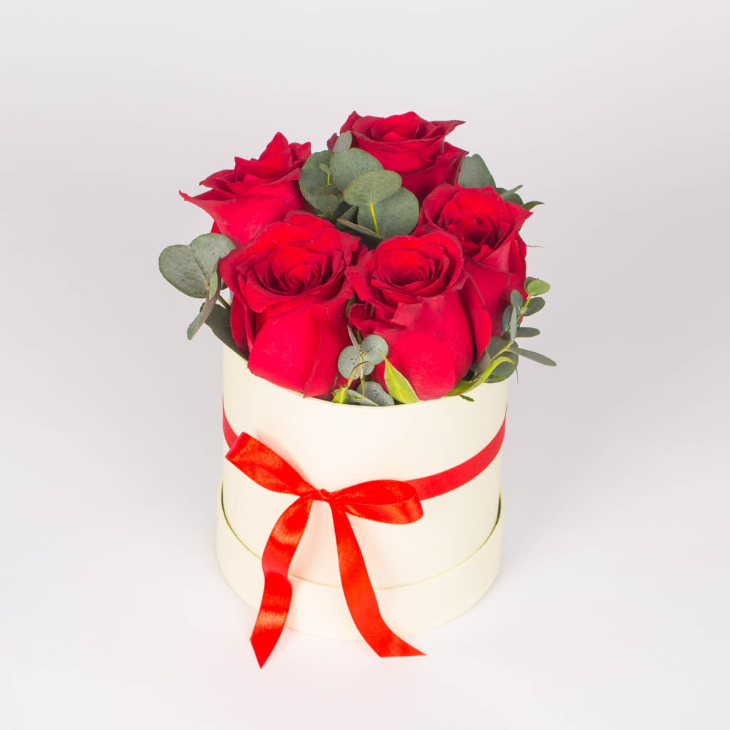Cutie rotunda cu 5 trandafiri rosii si verdeata de decor.