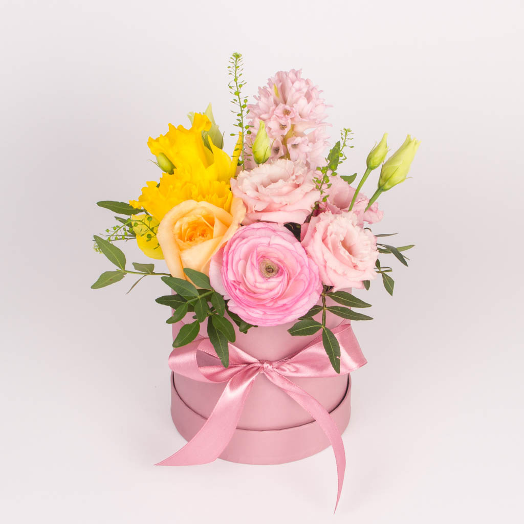 Cutie roz cu 3 narcise, ranunculus, lisianthus roz, zambila, verdeata si alte flori. Dimensiunile cutiei: 13×12,5 cm.