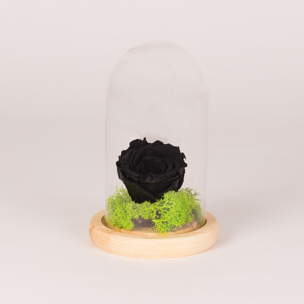 Clopot de sticla d12cm h20cm cu baza de lemn, trandafir conservat negru, muschi