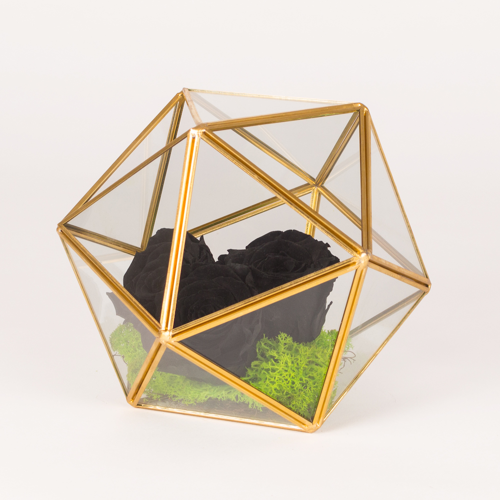 Prisma sfera diam20cm cu 3 trandafiri conservati negri, muschi verde si cuib mic.