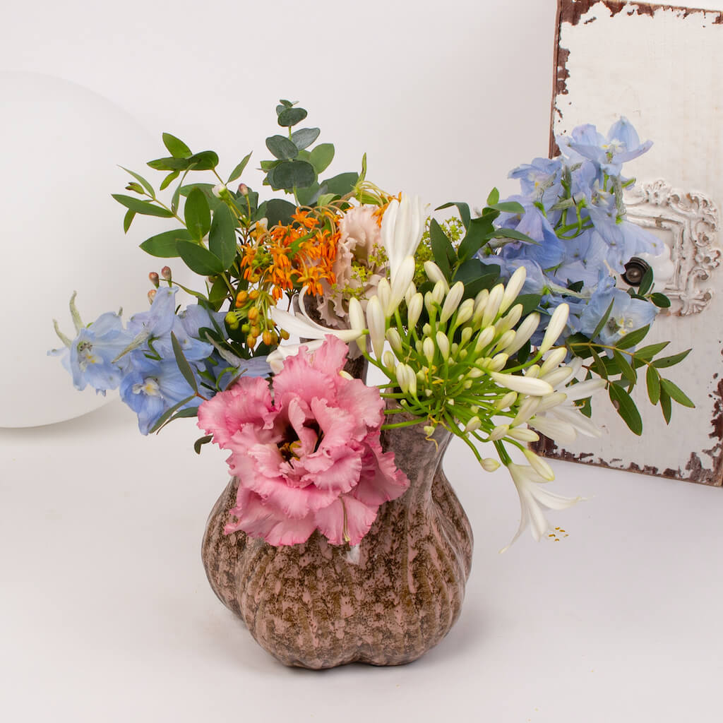 Aranjament in vaza cu 2 delphinium albastru, lisianthus roz, 2 agapanthus alb, verdeata si alte flori de decor.