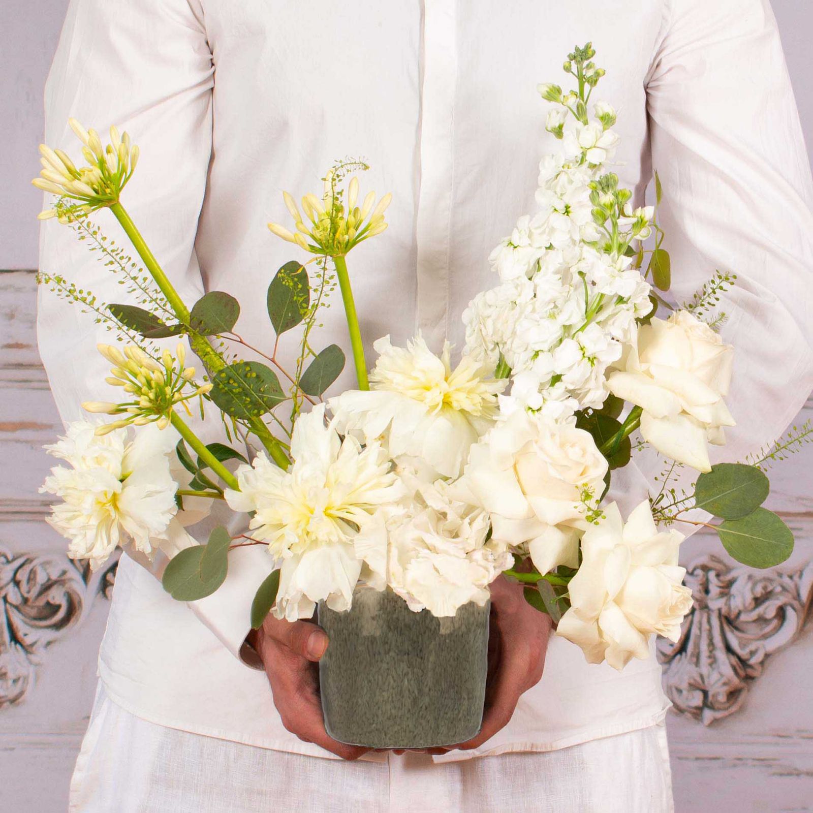 Green-gold vase, white hydrangea, white peony, white agapanthus, white rose, matthiola, populus eucalyptus, green bell, reindeer spring moss.