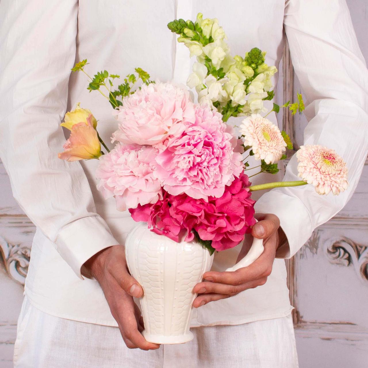 Arrangement in a small pitcher vase, 1 pink peony, 3 lisianthus, 1 anthirinum, 2 buplerum, greenery and other decorative flowers.