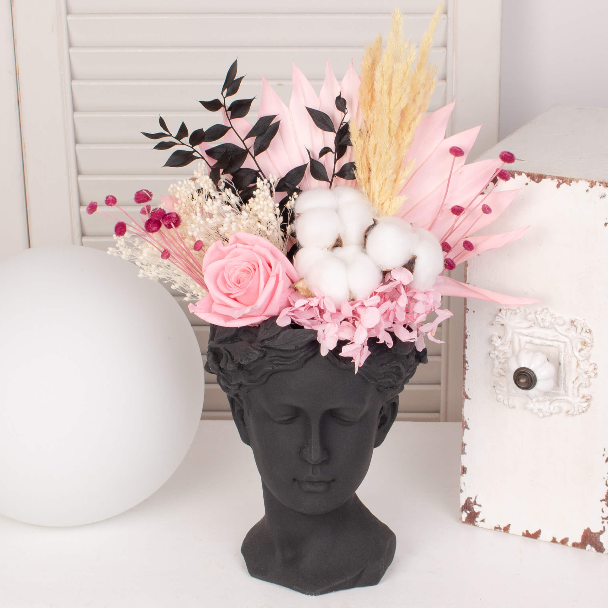 Venus vase, preserved rose, preserved palm and other preserved flowers