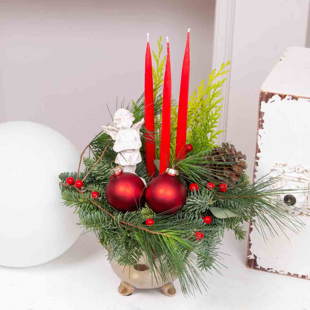 Arrangement in vase with 2 medium red globes, 3 candles, white angel figurine, greenery and other decorative elements.