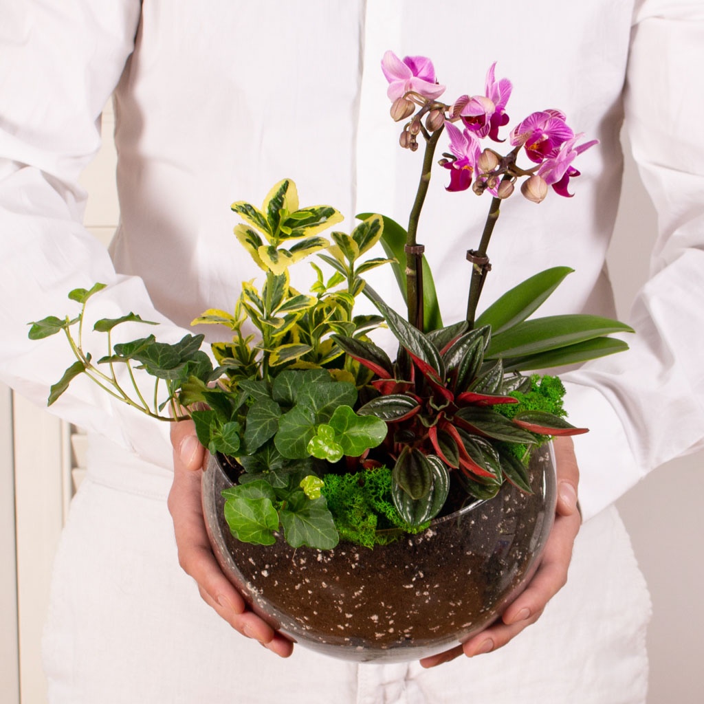 To get the most out of this plant arrangement or terrarium, please add a little water to the right of each plant whenever needed. As terrariums or plant arrangements are made in pots that do not allow excess water to drain away, the recommendation is to add water only when you see the substrate starting to dry out.